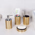 Infuse your bathroom with luxury using this stunning 4-piece bathroom accessory set featuring a brushed golden stripes design. This set includes a soap dish, toothbrush holder, mouthwash cup, and soap dispenser, blending practicality with opulent gold accents to create an elegant atmosphere in any space.
